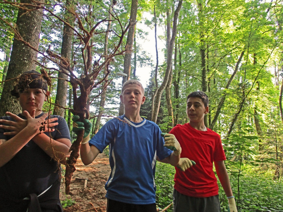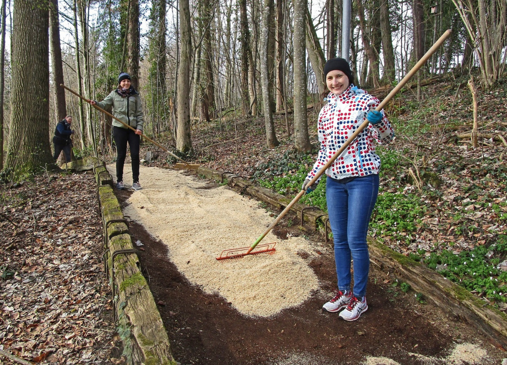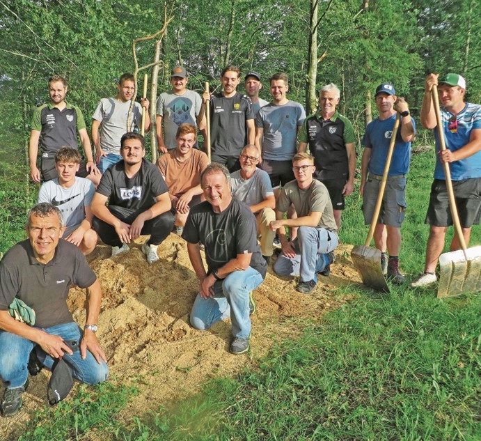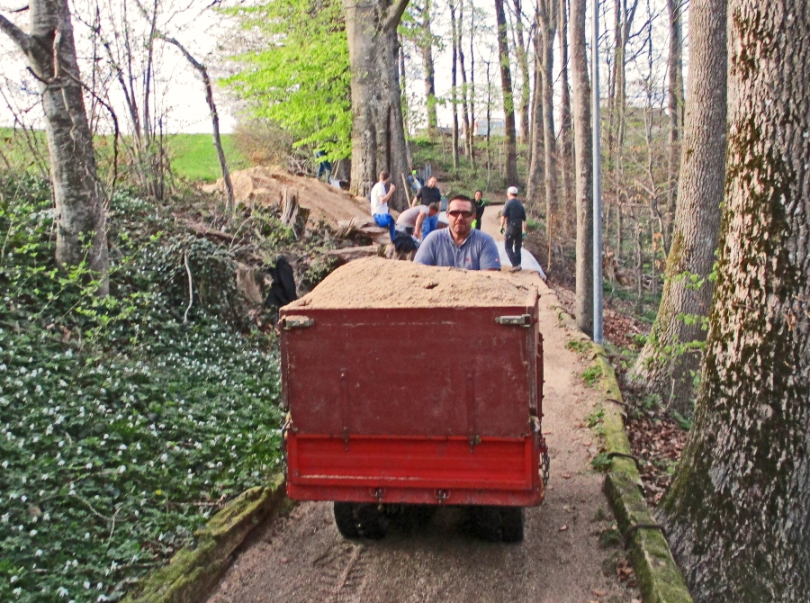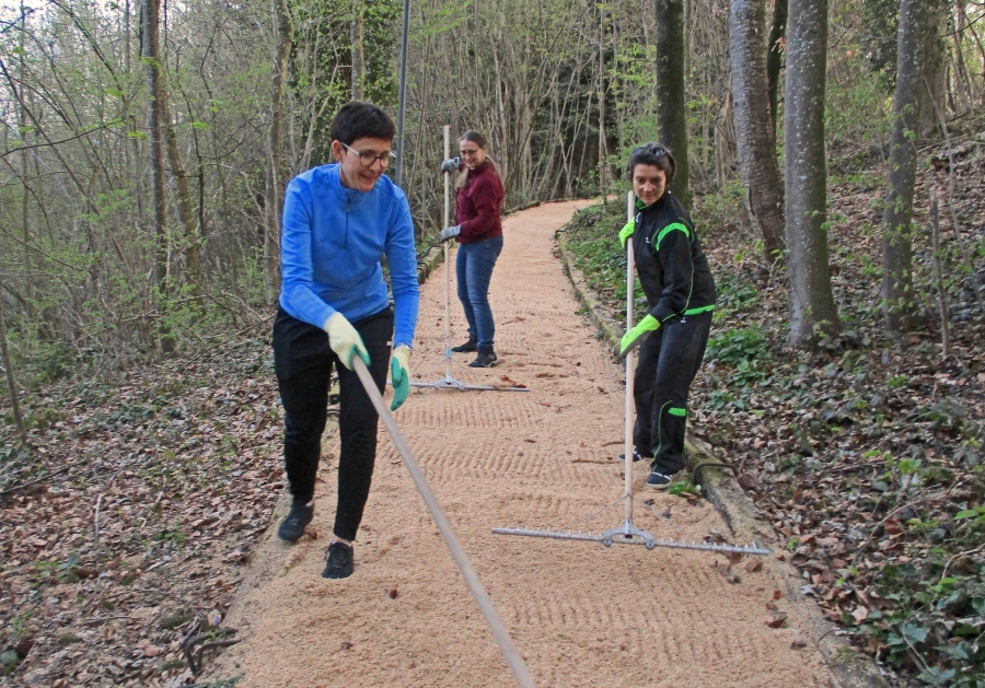 Bazenheider Oberstufenschülerinnen und -schüler entfernen mit viel Elan die vielen Wurzeln und füllen Sägemehl ein