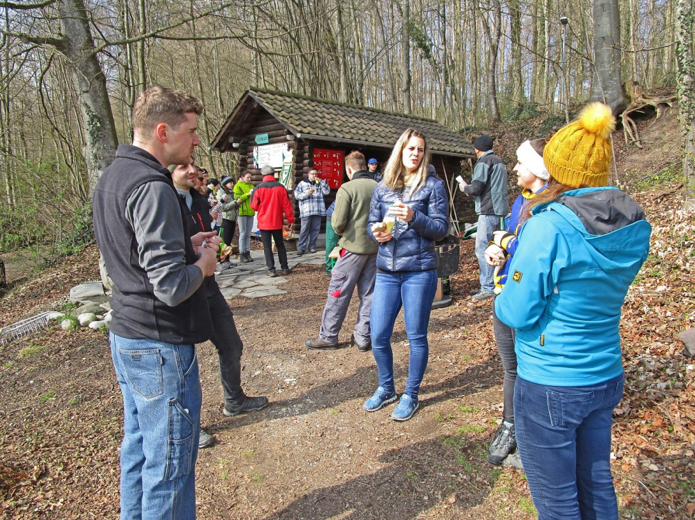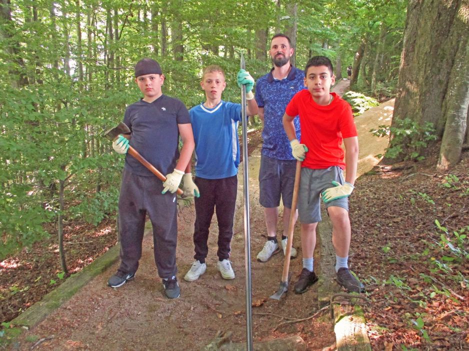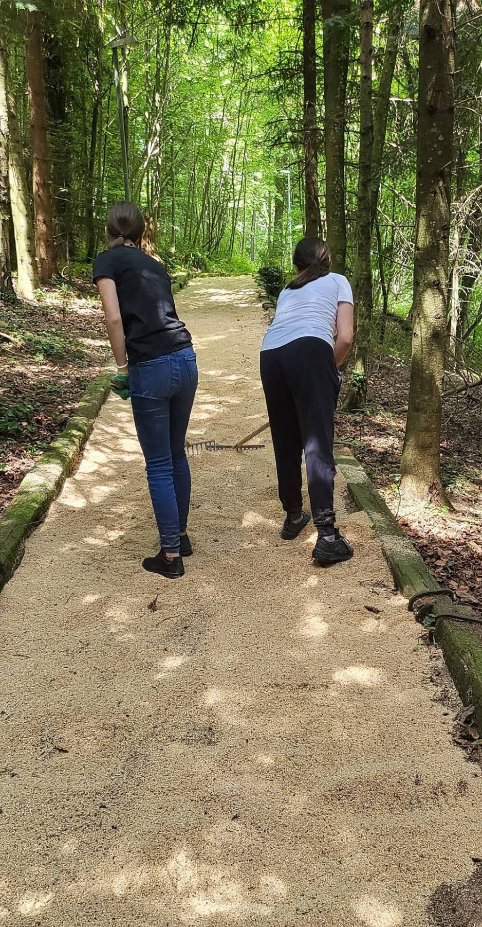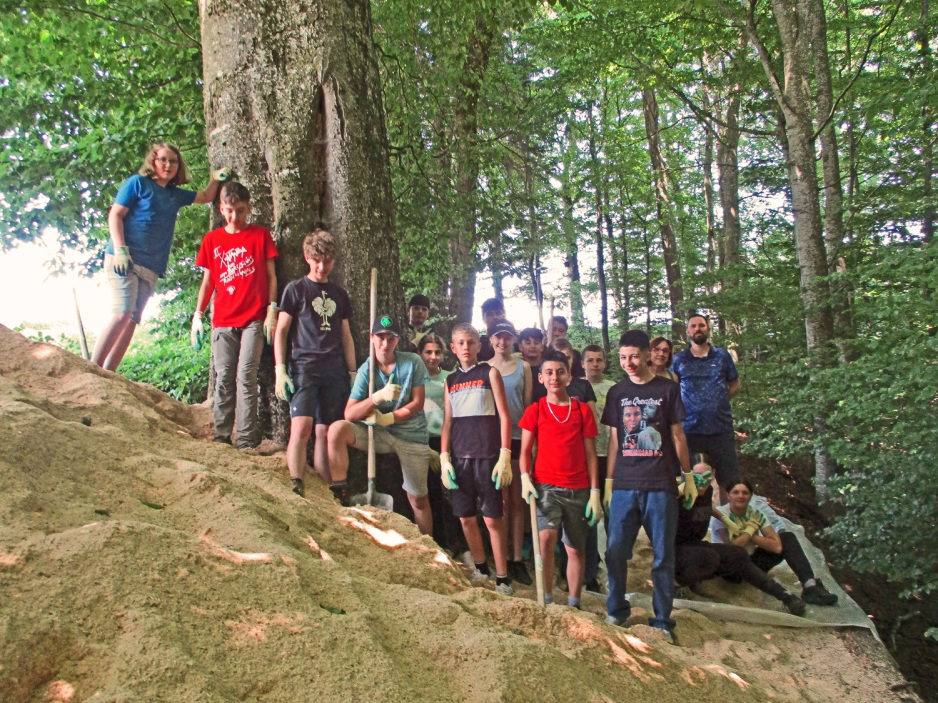 Bazenheider Oberstufenschülerinnen und -schüler entfernen mit viel Elan die vielen Wurzeln und füllen Sägemehl ein